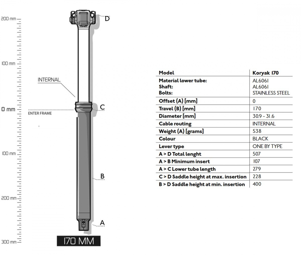 Die Koryak Vario-Sattelstuetze mit einem stufenlosen Verstellbereich von 170 mm fuer Rahmen mit 30,9 mm Durchmesser und interne Zugverlegung.