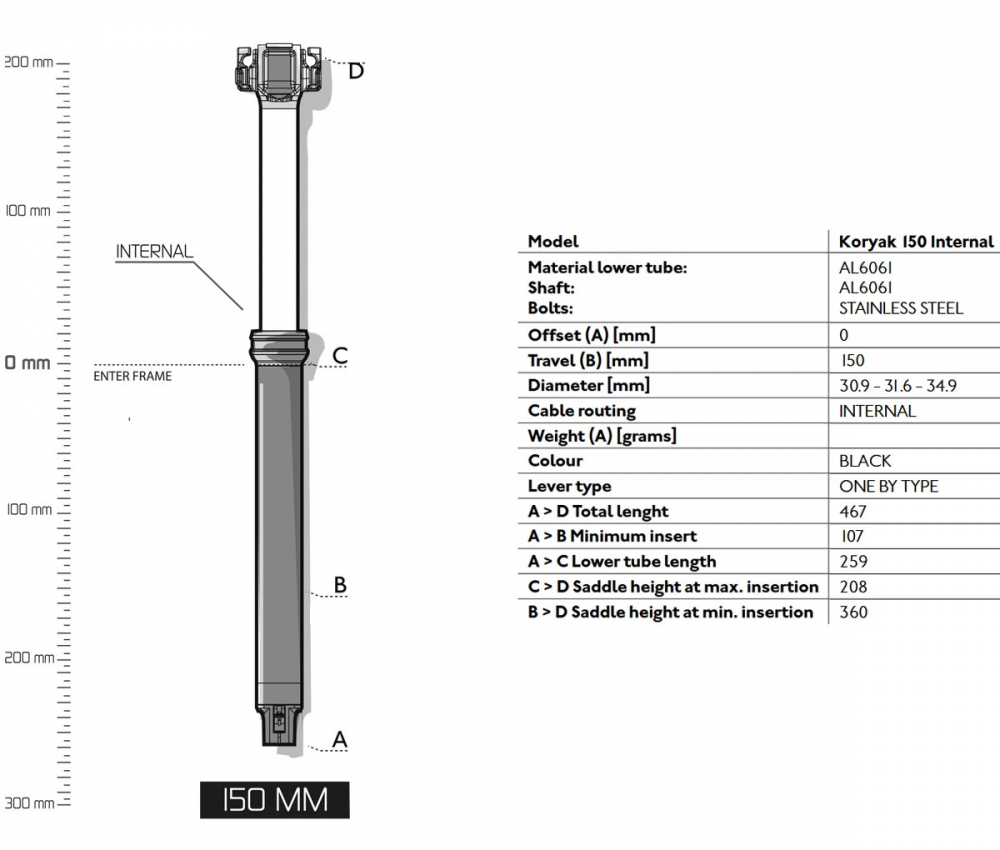 Die Koryak Vario-Sattelstuetze mit einem stufenlosen Verstellbereich von 150 mm fuer Rahmen mit 31,6 mm Durchmesser und interne Zugverlegung.