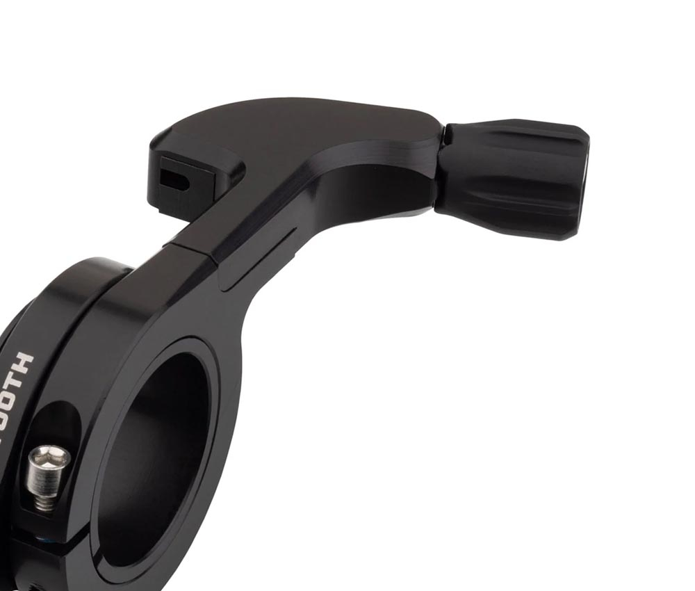 Das schlanke Design schafft Raum fuer eine problemlose Positionierung auf der linken Seite zwischen Lenkergriff und Schalthebeln, Federgabel-Lockouts oder anderen E-Bike-Bediehnunelementen. Vier unterschiedliche Hebelpositionen ermoeglichen ordentlich Raum fuer einstellbare Reichweitenoptionen des Daumens und sorgen fuer mehr Kontrollfreiheit. Die Ringform des Hebels ist gleichzeitig die Drehpunktachse, welche aus einem massiven Enduro Kugellager besteht und die Hebelwirkung zum Ausloesen der Vario-Sattelstuetze erheblich erleichtert. Abgerundet wird das Setup durch eine saubere und effiziente Kabelfuehrung um andere Elemente herum, so steht dem Umbau nichts mehr im Weg.